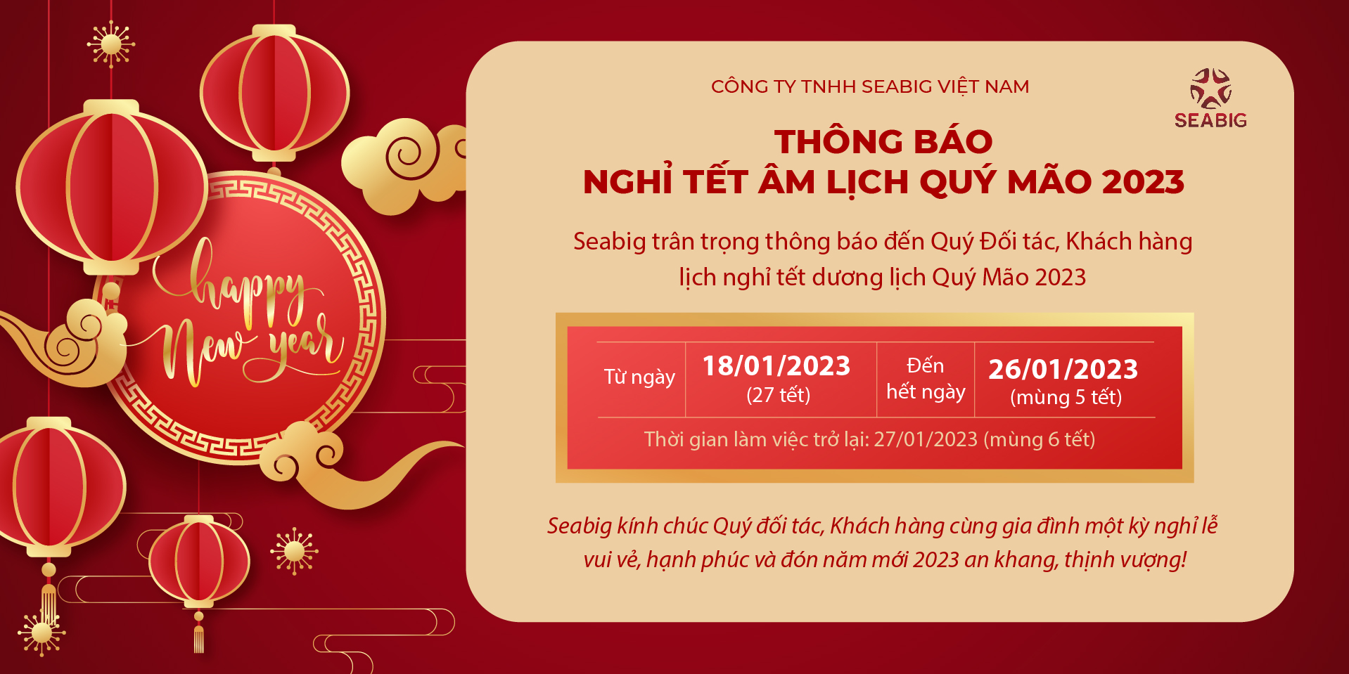 Năm Quý Mão 2023 đang đến rất gần, ban lãnh đão Công ty TNHH SEABIG Việt Nam xin gửi lời cảm ơn đến tất cả quý khách hàng đã đồng hành và ủng hộ chúng tôi trong suốt thời gian qua. Mừng Xuân Quý Mão SEABIG xin chúc quý khách hàng một năm mới AN KHANG – THỊNH VƯỢNG – VẠN SỰ NHƯ Ý.